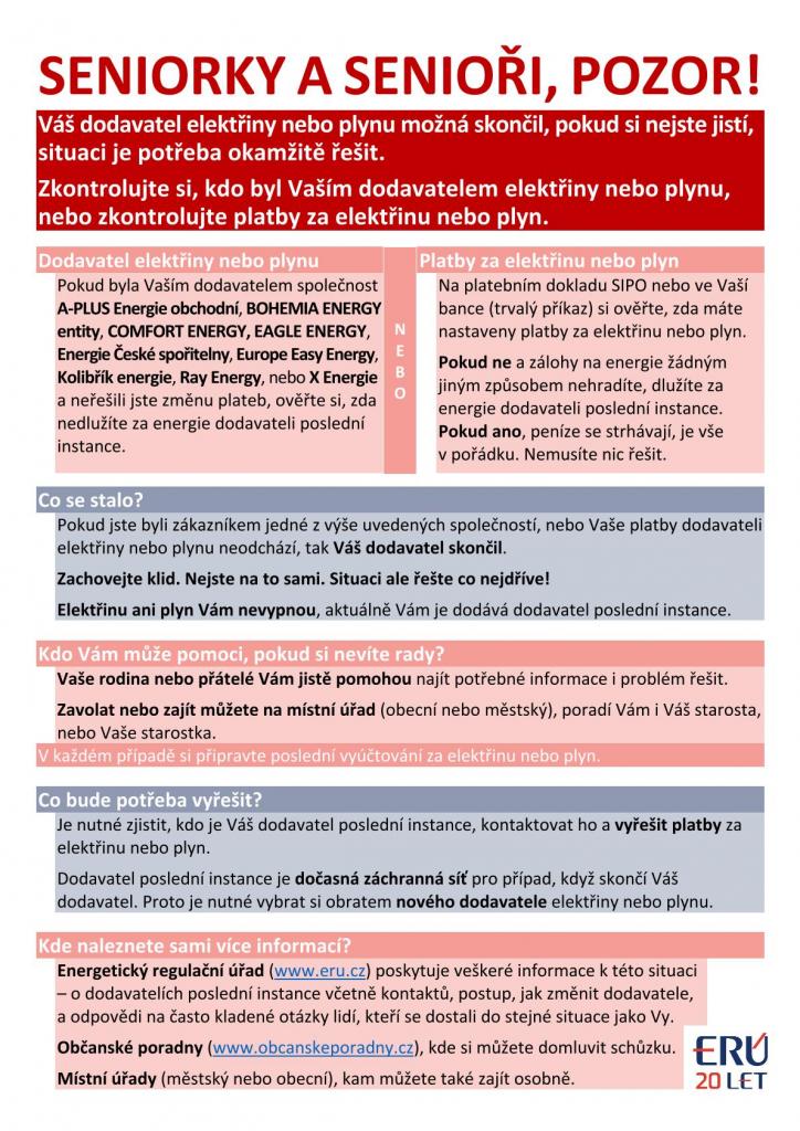 Pokud Váš dodavatel energie (elektřiny nebo plynu) ukončil činnost, nastupuje místo něj dodavatel poslední instance. Ten má povinnost Vás okamžitě informovat o zahájení dodávek energie, cenách a podmínkách dodávek. Do šesti měsíců si musíte najít nového dodavatele energie. ERÚ všem zákazníkům důrazně doporučuje, aby na standardní produkty obchodníků aktivně přešli co nejdříve a využívali formuláře na webových stránkách nově zvolených dodavatelů.