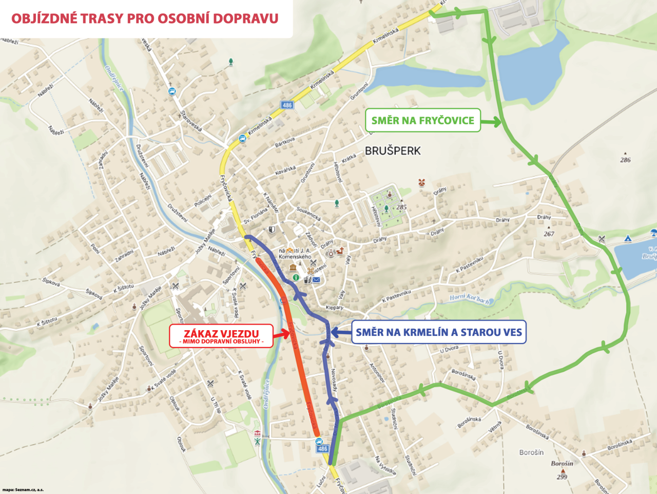Z důvodu uzavření hlavního tahu městem v lokalitě "Brušperk střed" byly vyznačeny objízdné trasy pro osobní dopravu, které můžete vidět na přiložené mapě. Uzavírka bude dle informací z dnešního dne relativně dlouhá a trvat bude v řádu týdnů.