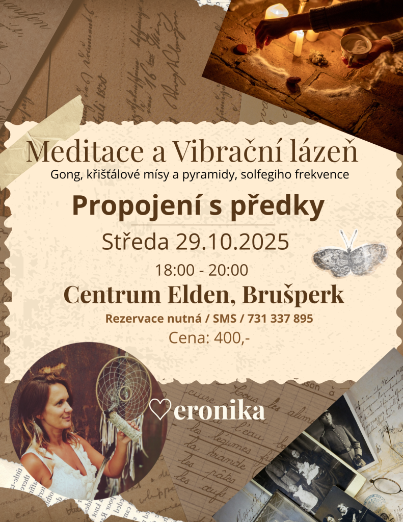 Zveme vás na unikátní akci, kde se spojíte s předky prostřednictvím meditace a vibrační lázně. Akce se uskuteční ve středu 29. října 2025 od 18:00 do 20:00 v Centru Elden v Brušperku. Na programu je využití gongu, křišťálových mís a pyramid, stejně jako solfegiho frekvencí. Vzhledem k charakteru akce je rezervace nutná, prosíme o zaslání SMS na číslo 731 337 895.