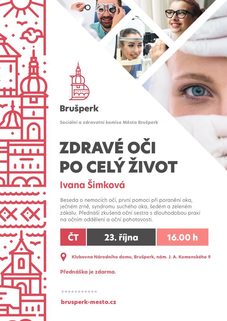 Zveme vás na besedu zaměřenou na zdraví očí. Během této přednášky se dozvíte o různých onemocněních očí a také o první pomoci při poranění oka. Zkušená oční sestra, která má dlouholetou praxi, vám přiblíží problematiku ječného zrní, syndromu suchého oka, šedého a zeleného zákalu. Nezmeškejte tuto jedinečnou příležitost se vzdělat v oblasti očního zdraví.